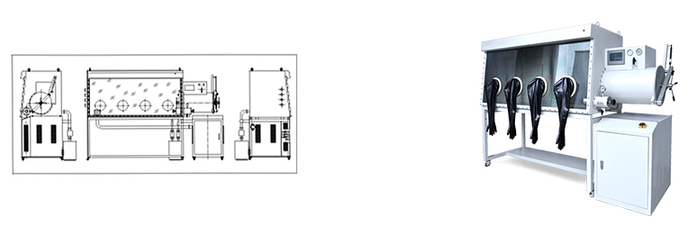 (注:4个手套箱体,均为组合式箱体,组合式手套箱箱体,可依据客户要求多节组合,净化柱净化能力需依据实际情况选配与设计。)