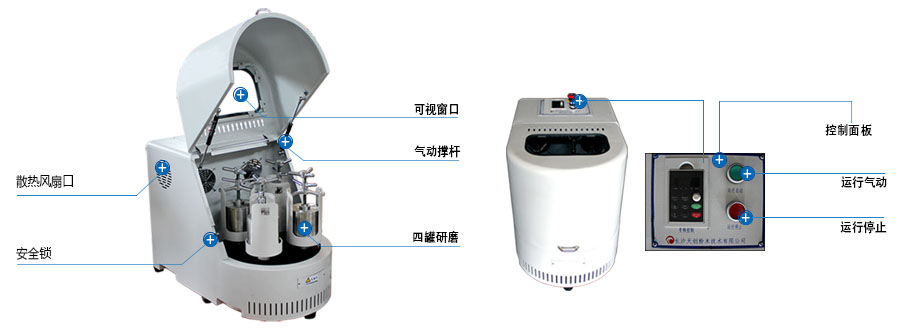 设备外壳采用半圆形设计元素,高精密模具冲压成型,大方精致,高端稳重;机加零件采用数控加工工艺,行星盘整体铸造成型,传动齿轮选用特殊材质精密齿轮,确保设备高速运行时平稳安静;磨罐压紧装置操作便捷、安全可靠。